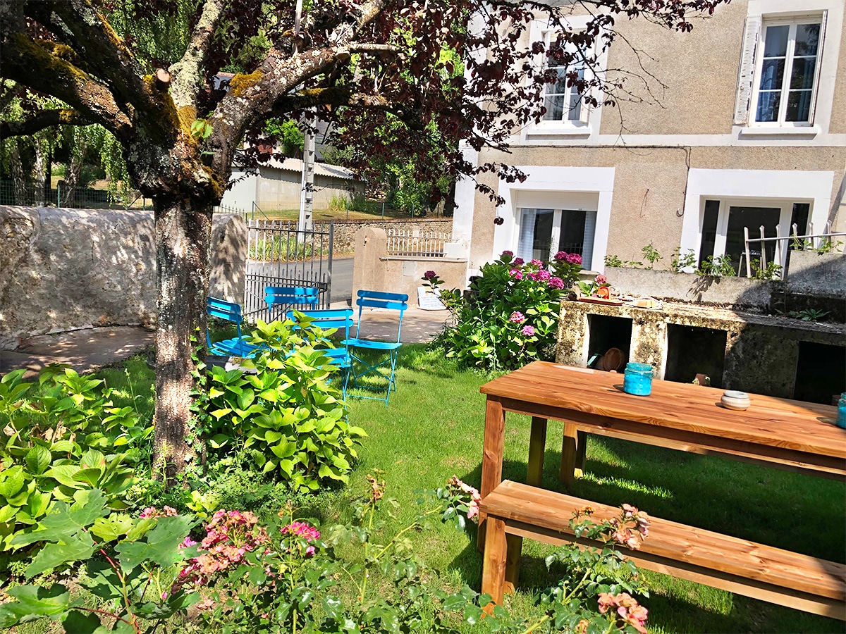 Cour intérieure avec jardinet ombragé : tables, relax, barbecue et table de ping-pong à disposition.